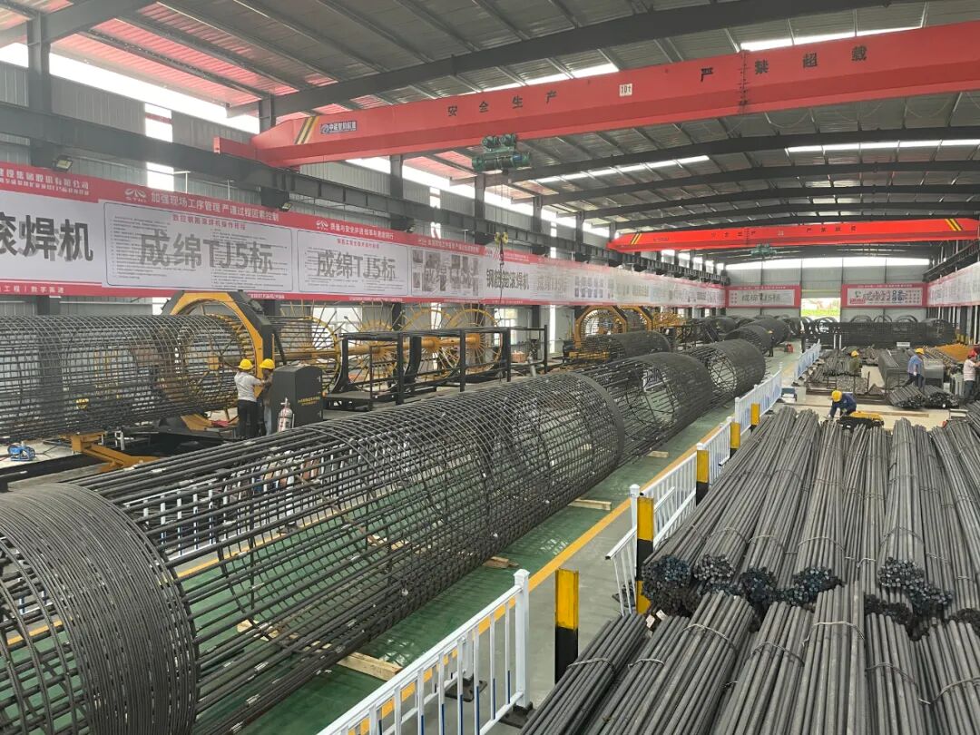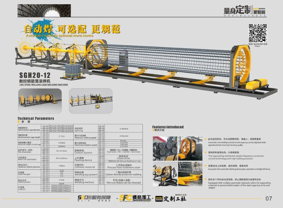 設備定制: 針對該項目墩柱鋼筋籠標準高,大量雙纏繞φ14繞筋、50根φ32主筋鋼筋籠的特殊需求,選用定制SGH22-12數控鋼筋籠滾焊機和SGH25-12數控鋼筋籠滾焊機各1臺,輕松實現加工,不但滿足了鋼筋籠標準高、需求大的特殊要求又提高了效率;