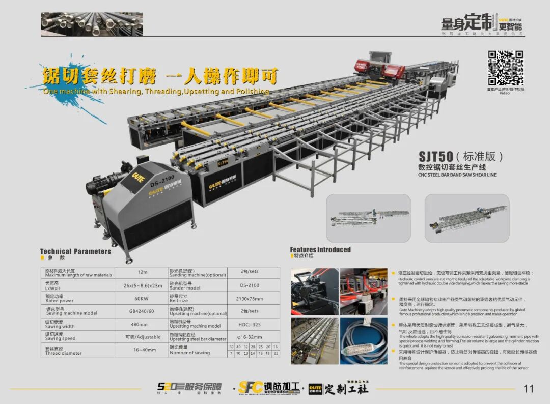 設備定制: 針對該項目鋼筋螺紋連接需求,**了SJT50數控鋸切套絲生產線,自動下料、套絲、打磨一體完成一人操作,大幅度提高效率和減少用工,并且滿足日均**1200個絲頭的產量!